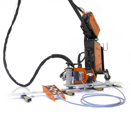 MagTrac F 61 以套装出售,该套装包含焊接小车装置、电源、送丝机、用于机械化焊接的焊枪和必要的电缆。 您可以随意选择一个套装,该套装包含一个 SuperSnake 中继送丝机,可使工作范围扩展多达 25 米。